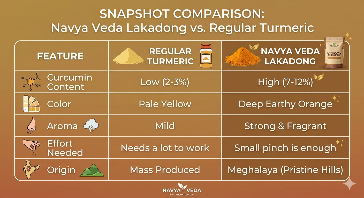 Insane Curcumin Levels: Regular turmeric has 2-3% curcumin. Lakadong has a whopping 7-12%. You get 3x to 5x the benefit in every spoon.